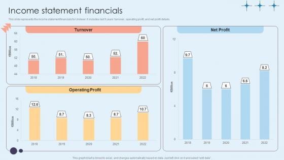 This slide represents the income statement financials for Unilever. It includes last 5 yearsturnover, operating profit, and net profit details.Welcome to our selection of the Income Statement Financials Home Care Solutions Company Profile CP SS V. These are designed to help you showcase your creativity and bring your sphere to life. Planning and Innovation are essential for any business that is just starting out. This collection contains the designs that you need for your everyday presentations. All of our PowerPoints are 100 percent editable, so you can customize them to suit your needs. This multi-purpose template can be used in various situations. Grab these presentation templates today. This slide represents the income statement financials for Unilever. It includes last 5 yearsturnover, operating profit, and net profit details.