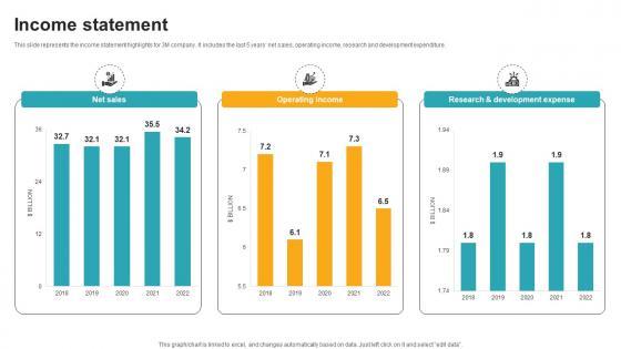 This slide represents the income statement highlights for 3M company. It includes the last 5 years net sales, operating income, research and development expenditure.Find highly impressive Income Statement Innovative Industrial Solutions Company Profile CP SS V on Slidegeeks to deliver a meaningful presentation. You can save an ample amount of time using these presentation templates. No need to worry to prepare everything from scratch because Slidegeeks experts have already done a huge research and work for you. You need to download Income Statement Innovative Industrial Solutions Company Profile CP SS V for your upcoming presentation. All the presentation templates are 100 percent editable and you can change the color and personalize the content accordingly. Download now This slide represents the income statement highlights for 3M company. It includes the last 5 years net sales, operating income, research and development expenditure.