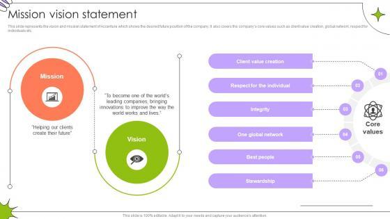 This slide represents the vision and mission statement of Accenture which shows the desired future position of the company. It also covers the companys core values such as client value creation, global network, respect for individuals etc.This Mission Vision Statement Global Innovation And Business Solutions Company Profile CP SS V is perfect for any presentation, be it in front of clients or colleagues. It is a versatile and stylish solution for organizing your meetings. The Mission Vision Statement Global Innovation And Business Solutions Company Profile CP SS V features a modern design for your presentation meetings. The adjustable and customizable slides provide unlimited possibilities for acing up your presentation. Slidegeeks has done all the homework before launching the product for you. So, do not wait, grab the presentation templates today This slide represents the vision and mission statement of Accenture which shows the desired future position of the company. It also covers the companys core values such as client value creation, global network, respect for individuals etc.