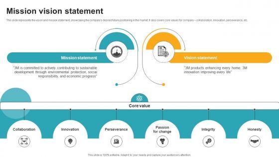 This slide represents the vision and mission statement, showcasing the companys desired future positioning in the market. It also covers core values for company collaboration, innovation, perseverance, etc.Formulating a presentation can take up a lot of effort and time, so the content and message should always be the primary focus. The visuals of the PowerPoint can enhance the presenters message, so our Mission Vision Statement Innovative Industrial Solutions Company Profile CP SS V was created to help save time. Instead of worrying about the design, the presenter can concentrate on the message while our designers work on creating the ideal templates for whatever situation is needed. Slidegeeks has experts for everything from amazing designs to valuable content, we have put everything into Mission Vision Statement Innovative Industrial Solutions Company Profile CP SS V. This slide represents the vision and mission statement, showcasing the companys desired future positioning in the market. It also covers core values for company collaboration, innovation, perseverance, etc.