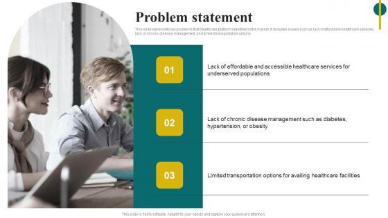 This slide represents key problems that healthcare platform identified in the market. It includes issues such as lack of affordable healthcare services, lack of chronic disease management, and limited transportation options. Make sure to capture your audiences attention in your business displays with our gratis customizable Problem Statement Digital Healthcare Solution Investor Funding Mockup Pdf. These are great for business strategies, office conferences, capital raising or task suggestions. If you desire to acquire more customers for your tech business and ensure they stay satisfied, create your own sales presentation with these plain slides. This slide represents key problems that healthcare platform identified in the market. It includes issues such as lack of affordable healthcare services, lack of chronic disease management, and limited transportation options.