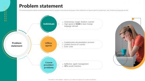 This slide presents the details about the problems faced by people in learning new languages. It also states the key figures spent by people every year in learning a language abroad, Formulating a presentation can take up a lot of effort and time, so the content and message should always be the primary focus. The visuals of the PowerPoint can enhance the presenters message, so our Problem Statement Digital Language Learning Solution Pitch Deck was created to help save time. Instead of worrying about the design, the presenter can concentrate on the message while our designers work on creating the ideal templates for whatever situation is needed. Slidegeeks has experts for everything from amazing designs to valuable content, we have put everything into Problem Statement Digital Language Learning Solution Pitch Deck. This slide presents the details about the problems faced by people in learning new languages. It also states the key figures spent by people every year in learning a language abroad
