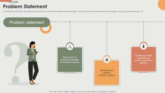 This slide shows information regarding the problem faced by the customers in website development industry. These problems are requirement of technical knowledge, managing and updating websites, etc. Formulating a presentation can take up a lot of effort and time, so the content and message should always be the primary focus. The visuals of the PowerPoint can enhance the presenters message, so our Problem Statement E Commerce Solutions Offering Company Fundraising Pitch Deck was created to help save time. Instead of worrying about the design, the presenter can concentrate on the message while our designers work on creating the ideal templates for whatever situation is needed. Slidegeeks has experts for everything from amazing designs to valuable content, we have put everything into Problem Statement E Commerce Solutions Offering Company Fundraising Pitch Deck. This slide shows information regarding the problem faced by the customers in website development industry. These problems are requirement of technical knowledge, managing and updating websites, etc.