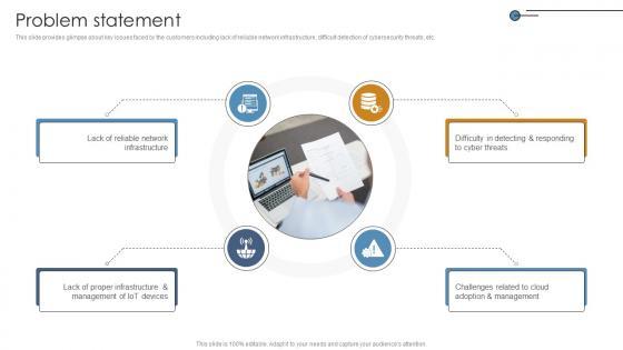 This slide provides glimpse about key issues faced by the customers including lack of reliable network infrastructure, difficult detection of cybersecurity threats, etc. Formulating a presentation can take up a lot of effort and time, so the content and message should always be the primary focus. The visuals of the PowerPoint can enhance the presenters message, so our Problem Statement Networking Solutions Manufacturer Investor Funding Elevator Pitch Deck was created to help save time. Instead of worrying about the design, the presenter can concentrate on the message while our designers work on creating the ideal templates for whatever situation is needed. Slidegeeks has experts for everything from amazing designs to valuable content, we have put everything into Problem Statement Networking Solutions Manufacturer Investor Funding Elevator Pitch Deck. This slide provides glimpse about key issues faced by the customers including lack of reliable network infrastructure, difficult detection of cybersecurity threats, etc.