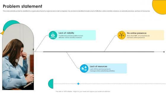 This slide exhibits problems identified by organisation faced by regional and small companies. Key problems identified include a lack of effective online visibility solutions, no website presence, and lack of resources. Formulating a presentation can take up a lot of effort and time, so the content and message should always be the primary focus. The visuals of the PowerPoint can enhance the presenters message, so our Problem Statement Online Marketing Solutions Pitch Deck was created to help save time. Instead of worrying about the design, the presenter can concentrate on the message while our designers work on creating the ideal templates for whatever situation is needed. Slidegeeks has experts for everything from amazing designs to valuable content, we have put everything into Problem Statement Online Marketing Solutions Pitch Deck This slide exhibits problems identified by organisation faced by regional and small companies. Key problems identified include a lack of effective online visibility solutions, no website presence, and lack of resources.