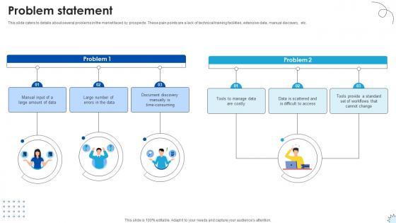 This slide caters to details about several problems in the market faced by prospects. These pain points are a lack of technical training facilities, extensive data, manual discovery, etc. Formulating a presentation can take up a lot of effort and time, so the content and message should always be the primary focus. The visuals of the PowerPoint can enhance the presenters message, so our Problem Statement Technology Solutions Provider Investor Funding Elevator Pitch Deck was created to help save time. Instead of worrying about the design, the presenter can concentrate on the message while our designers work on creating the ideal templates for whatever situation is needed. Slidegeeks has experts for everything from amazing designs to valuable content, we have put everything into Problem Statement Technology Solutions Provider Investor Funding Elevator Pitch Deck This slide caters to details about several problems in the market faced by prospects. These pain points are a lack of technical training facilities, extensive data, manual discovery, etc.