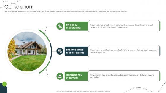 This slide presents the key solutions offered by online real estate platform. It mentions solutions such as efficiency in searching, effective agent tools and transparency in services. Make sure to capture your audiences attention in your business displays with our gratis customizable Our Solution Land And Property Marketplace Pitch Deck PPT Slide. These are great for business strategies, office conferences, capital raising or task suggestions. If you desire to acquire more customers for your tech business and ensure they stay satisfied, create your own sales presentation with these plain slides. This slide presents the key solutions offered by online real estate platform. It mentions solutions such as efficiency in searching, effective agent tools and transparency in services.
