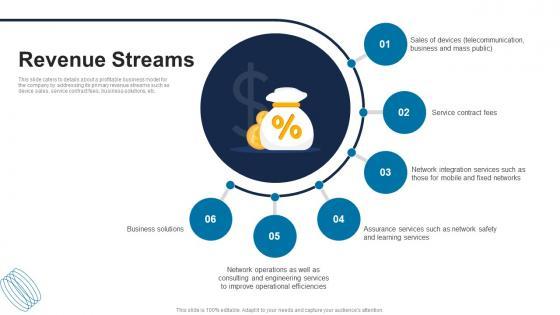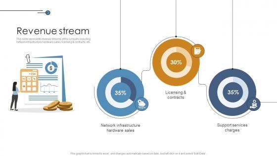 This slide represents revenue streams of the company including network infrastructure hardware sales, licensing and contracts, etc. This modern and well-arranged Revenue Stream Networking Solutions Manufacturer Investor Funding Elevator Pitch Deck provides lots of creative possibilities. It is very simple to customize and edit with the Powerpoint Software. Just drag and drop your pictures into the shapes. All facets of this template can be edited with Powerpoint, no extra software is necessary. Add your own material, put your images in the places assigned for them, adjust the colors, and then you can show your slides to the world, with an animated slide included. This slide represents revenue streams of the company including network infrastructure hardware sales, licensing and contracts, etc.