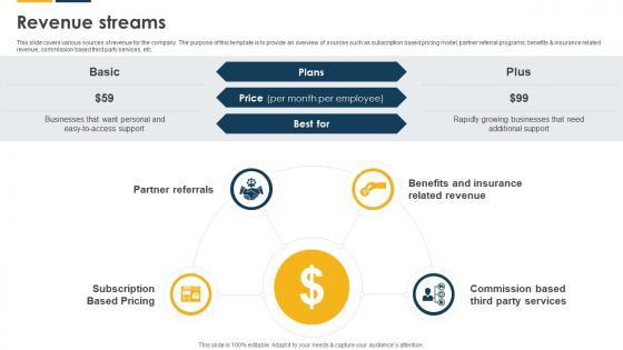 This slide covers various sources of revenue for the company. The purpose of this template is to provide an overview of sources such as subscription based pricing model, partner referral programs, benefits and insurance related revenue, commission based third party services, etc. Coming up with a presentation necessitates that the majority of the effort goes into the content and the message you intend to convey. The visuals of a PowerPoint presentation can only be effective if it supplements and supports the story that is being told. Keeping this in mind our experts created Revenue Streams Payroll Solutions Provider Investor Funding Elevator Pitch Deck to reduce the time that goes into designing the presentation. This way, you can concentrate on the message while our designers take care of providing you with the right template for the situation. This slide covers various sources of revenue for the company. The purpose of this template is to provide an overview of sources such as subscription based pricing model, partner referral programs, benefits and insurance related revenue, commission based third party services, etc.