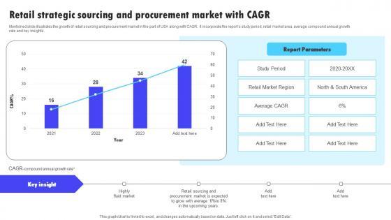 Mentioned slide illustrates the growth of retail sourcing and procurement market in the part of USA along with CAGR. It incorporate the reports study period, retail market area, average compound annual growth rate and key insights. Showcasing this set of slides titled Retail Strategic Sourcing And Procurement Market With Cagr Infographics Pdf. The topics addressed in these templates are Reports Study Period, Retail Market Area, Average Compound0. All the content presented in this PPT design is completely editable. Download it and make adjustments in color, background, font etc. as per your unique business setting. Mentioned slide illustrates the growth of retail sourcing and procurement market in the part of USA along with CAGR. It incorporate the reports study period, retail market area, average compound annual growth rate and key insights.