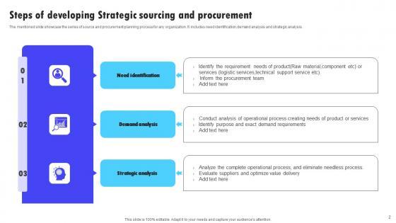 The mentioned slide showcase the series of source and procurement planning process for any organization. It includes need identification,demand analysis and strategic analysis. Pitch your topic with ease and precision using this Steps Of Developing Strategic Sourcing And Procurement Template Pdf. This layout presents information on Need Identification, Demand Analysis, Strategic Analysis. It is also available for immediate download and adjustment. So, changes can be made in the color, design, graphics or any other component to create a unique layout. The mentioned slide showcase the series of source and procurement planning process for any organization. It includes need identification,demand analysis and strategic analysis.