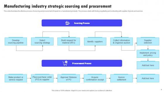 This slide illustrates the effective process of sourcing and procurement of inputs for a manufacturing industry. The process starts with finding,negotiating and contracting with supplier of goods and services. Pitch your topic with ease and precision using this Manufacturing Industry Strategic Sourcing And Procurement Microsoft Pdf. This layout presents information on Sourcing Process, Procurement Process, Invoice Settlement. It is also available for immediate download and adjustment. So, changes can be made in the color, design, graphics or any other component to create a unique layout. This slide illustrates the effective process of sourcing and procurement of inputs for a manufacturing industry. The process starts with finding,negotiating and contracting with supplier of goods and services.