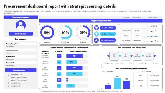 Introducing our 5 year roadmap for procurement and sourcing change portrait. This PPT presentation is Google Slides compatible, therefore, you can share it easily with the collaborators for measuring the progress. Also, the presentation is available in both standard screen and widescreen aspect ratios. So edit the template design by modifying the font size, font type, color, and shapes as per your requirements. As this PPT design is fully editable it can be presented in PDF, JPG and PNG formats.