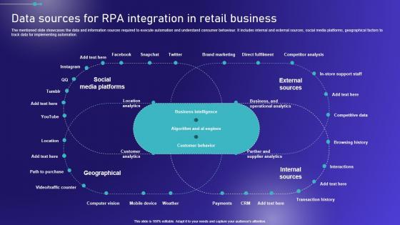 The mentioned slide showcases the data and information sources required to execute automation and understand consumer behaviour. It includes internal and external sources, social media platforms, geographical factors to track data for implementing automation. Are you in need of a template that can accommodate all of your creative concepts This one is crafted professionally and can be altered to fit any style. Use it with Google Slides or PowerPoint. Include striking photographs, symbols, depictions, and other visuals. Fill, move around, or remove text boxes as desired. Test out color palettes and font mixtures. Edit and save your work, or work with colleagues. Download Data Sources For RPA Integration In Retail Business Graphics PDF and observe how to make your presentation outstanding. Give an impeccable presentation to your group and make your presentation unforgettable.