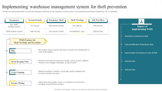 This slide showcases implementation of warehouse management system that can help organization in theft prevention. It showacses features and impact of implementing WMS in organization. Whether you have daily or monthly meetings, a brilliant presentation is necessary. Implementing Warehouse Management Methods To Enhance Warehouse Space Utilization Themes Pdf can be your best option for delivering a presentation. Represent everything in detail using Implementing Warehouse Management Methods To Enhance Warehouse Space Utilization Themes Pdf and make yourself stand out in meetings. The template is versatile and follows a structure that will cater to your requirements. All the templates prepared by Slidegeeks are easy to download and edit. Our research experts have taken care of the corporate themes as well. So, give it a try and see the results. This slide showcases implementation of warehouse management system that can help organization in theft prevention. It showacses features and impact of implementing WMS in organization.
