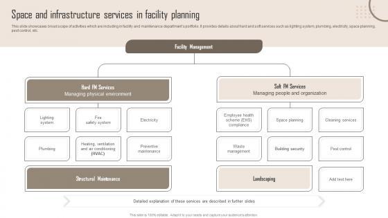 This slide showcases broad scope of activities which are including in facility and maintenance departments portfolio. It provides details about hard and soft services such as lighting system, plumbing, electricity, space planning, pest control, etc. This Space And Infrastructure Comprehensive Guide For Building Management Graphics Pdf from Slidegeeks makes it easy to present information on your topic with precision. It provides customization options, so you can make changes to the colors, design, graphics, or any other component to create a unique layout. It is also available for immediate download, so you can begin using it right away. Slidegeeks has done good research to ensure that you have everything you need to make your presentation stand out. Make a name out there for a brilliant performance. This slide showcases broad scope of activities which are including in facility and maintenance departments portfolio. It provides details about hard and soft services such as lighting system, plumbing, electricity, space planning, pest control, etc.