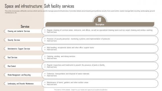 This slide showcases soft facility services which can be used to manage space and infrastructure. It provides details about cleaning and janitorial, security, food, pest control, waste management, recycling, landscaping, ground maintenance, etc. Take your projects to the next level with our ultimate collection of Space And Infrastructure Soft Comprehensive Guide For Building Management Rules Pdf. Slidegeeks has designed a range of layouts that are perfect for representing task or activity duration, keeping track of all your deadlines at a glance. Tailor these designs to your exact needs and give them a truly corporate look with your own brand colors they well make your projects stand out from the rest. This slide showcases soft facility services which can be used to manage space and infrastructure. It provides details about cleaning and janitorial, security, food, pest control, waste management, recycling, landscaping, ground maintenance, etc.
