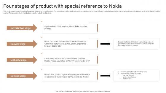 This slide covers several reasons for decline of sales for a mobile brand. The purpose of this template is provide users information about different products launched by the company along with reasons for its fall in the competitive market. The stages include introduction, growth, maturity and decline. Coming up with a presentation necessitates that the majority of the effort goes into the content and the message you intend to convey. The visuals of a PowerPoint presentation can only be effective if it supplements and supports the story that is being told. Keeping this in mind our experts created Four Stages Of Product With Special Reference To Nokia Inspiration PDF to reduce the time that goes into designing the presentation. This way, you can concentrate on the message while our designers take care of providing you with the right template for the situation.