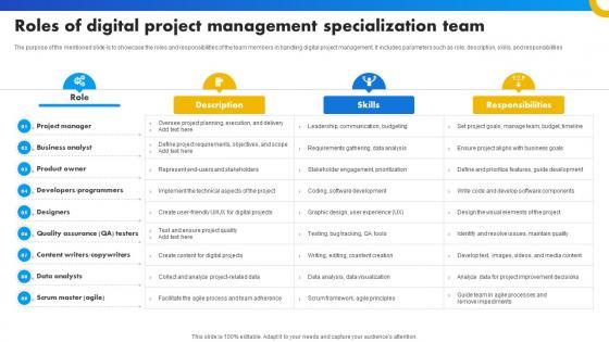 The purpose of the mentioned slide is to showcase the roles and responsibilities of the team members in handling digital project management. It includes parameters such as role, description, skills, and responsibilities. Create an editable Roles Of Digital Project Management Specialization Team Strategies For Success In Digital that communicates your idea and engages your audience. Whether you are presenting a business or an educational presentation, pre-designed presentation templates help save time. Roles Of Digital Project Management Specialization Team Strategies For Success In Digital is highly customizable and very easy to edit, covering many different styles from creative to business presentations. Slidegeeks has creative team members who have crafted amazing templates. So, go and get them without any delay. The purpose of the mentioned slide is to showcase the roles and responsibilities of the team members in handling digital project management. It includes parameters such as role, description, skills, and responsibilities.