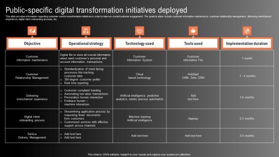 This slide provides information regarding customer centric transformation initiatives in order to improve overall customer engagement. The goals to attain include customer information maintenance, customer relationship management, delivering omnichannel experience, digital client onboarding process, etc. The Public Specific Digital Transformation Technological Innovation Playbook Template Pdf is a compilation of the most recent design trends as a series of slides. It is suitable for any subject or industry presentation, containing attractive visuals and photo spots for businesses to clearly express their messages. This template contains a variety of slides for the user to input data, such as structures to contrast two elements, bullet points, and slides for written information. Slidegeeks is prepared to create an impression. This slide provides information regarding customer centric transformation initiatives in order to improve overall customer engagement. The goals to attain include customer information maintenance, customer relationship management, delivering omnichannel experience, digital client onboarding process, etc.