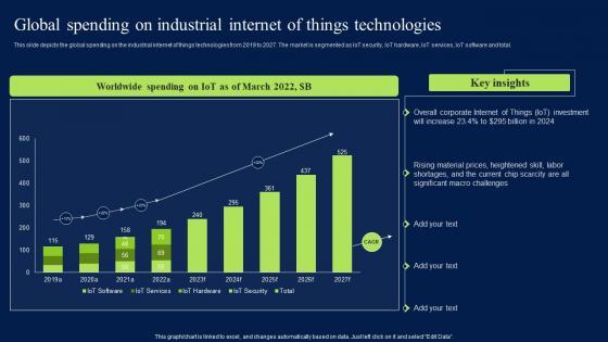This slide depicts the global spending on the industrial internet of things technologies from 2019 to 2027. The market is segmented as IoT security, IoT hardware, IoT services, IoT software and total. This modern and well-arranged Smart Manufacturing With Iot Global Spending On Industrial Internet Of Things Technologies Designs PDF provides lots of creative possibilities. It is very simple to customize and edit with the Powerpoint Software. Just drag and drop your pictures into the shapes. All facets of this template can be edited with Powerpoint, no extra software is necessary. Add your own material, put your images in the places assigned for them, adjust the colors, and then you can show your slides to the world, with an animated slide included.