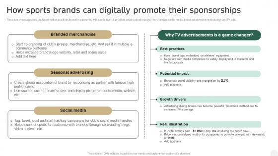 This slide showcases best digital promotion practices to use for partnering with sports team. It provides details about branded merchandize, social media, seasonal advertisement strategy and TV ads. Create an editable Fitness Product Promotion Campaigns How Sports Brands Can Digitally Promote Their Sponsorships Professional PDF that communicates your idea and engages your audience. Whether you are presenting a business or an educational presentation, pre-designed presentation templates help save time. Fitness Product Promotion Campaigns How Sports Brands Can Digitally Promote Their Sponsorships Professional PDF is highly customizable and very easy to edit, covering many different styles from creative to business presentations. Slidegeeks has creative team members who have crafted amazing templates. So, go and get them without any delay.