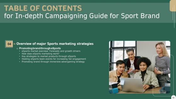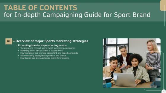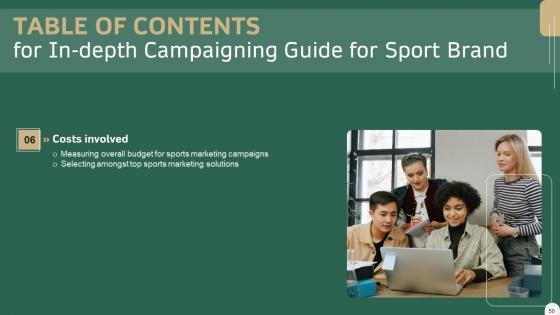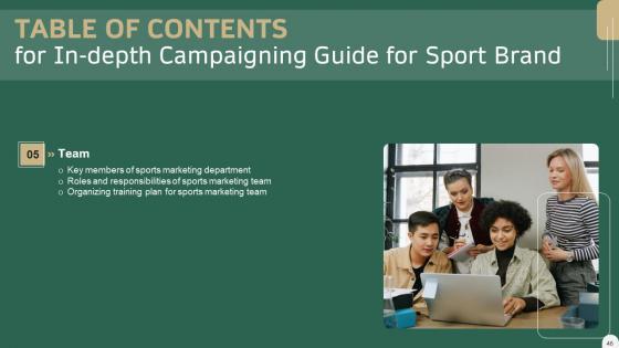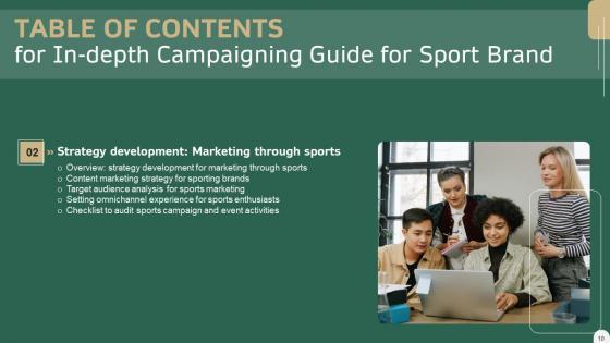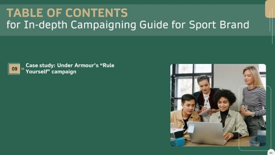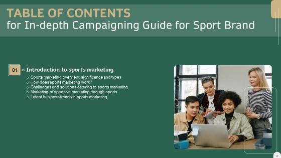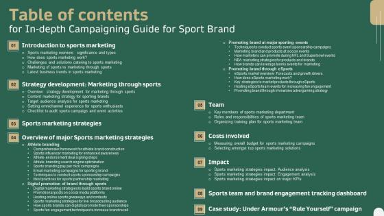 This modern and well-arranged In Depth Campaigning Guide For Sport Brand Table Of Contents Slides PDF provides lots of creative possibilities. It is very simple to customize and edit with the Powerpoint Software. Just drag and drop your pictures into the shapes. All facets of this template can be edited with Powerpoint, no extra software is necessary. Add your own material, put your images in the places assigned for them, adjust the colors, and then you can show your slides to the world, with an animated slide included. Our In Depth Campaigning Guide For Sport Brand Table Of Contents Slides PDF are topically designed to provide an attractive backdrop to any subject. Use them to look like a presentation pro.