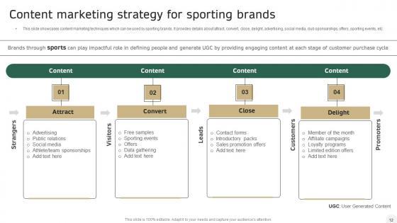 This slide showcases content marketing techniques which can be used by sporting brands. It provides details about attract, convert, close, delight, advertising, social media, club sponsorships, offers, sporting events, etc. Retrieve professionally designed Integrating Sports Marketing Campaign Content Marketing Strategy For Sporting Brands Infographics PDF to effectively convey your message and captivate your listeners. Save time by selecting pre-made slideshows that are appropriate for various topics, from business to educational purposes. These themes come in many different styles, from creative to corporate, and all of them are easily adjustable and can be edited quickly. Access them as PowerPoint templates or as Google Slides themes. You dont have to go on a hunt for the perfect presentation because Slidegeeks got you covered from everywhere.