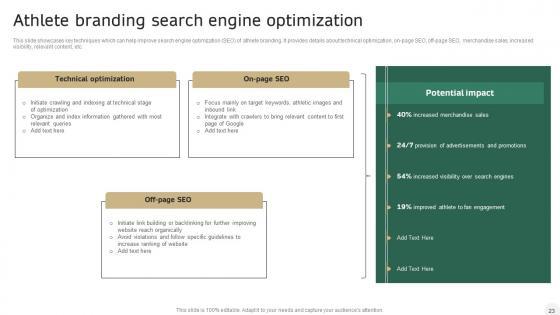 This slide showcases key techniques which can help improve search engine optimization SEO of athlete branding. It provides details about technical optimization, on-page SEO, off-page SEO, merchandise sales, increased visibility, relevant content, etc. This modern and well-arranged Integrating Sports Marketing Campaign Athlete Branding Search Engine Optimization Sample PDF provides lots of creative possibilities. It is very simple to customize and edit with the Powerpoint Software. Just drag and drop your pictures into the shapes. All facets of this template can be edited with Powerpoint, no extra software is necessary. Add your own material, put your images in the places assigned for them, adjust the colors, and then you can show your slides to the world, with an animated slide included.
