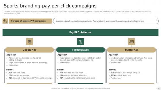 This slide shows key platforms which brands can use to initiate pay per click PPC campaigns. It provides details about Google Ads, Facebook Ads, Twitter Ads, clicks, conversions, audience reach, locational advertising, sponsored hashtags, etc. Create an editable Sports Branding Pay Per Click Campaigns Athletic Activities Advertising Program Template Pdf that communicates your idea and engages your audience. Whether you are presenting a business or an educational presentation, pre-designed presentation templates help save time. Sports Branding Pay Per Click Campaigns Athletic Activities Advertising Program Template Pdf is highly customizable and very easy to edit, covering many different styles from creative to business presentations. Slidegeeks has creative team members who have crafted amazing templates. So, go and get them without any delay. This slide shows key platforms which brands can use to initiate pay per click PPC campaigns. It provides details about Google Ads, Facebook Ads, Twitter Ads, clicks, conversions, audience reach, locational advertising, sponsored hashtags, etc.
