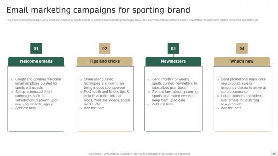 This slide showcases multiple ways which can be used by sports brands to initiate email marketing campaigns. It provides information about welcome emails, newsletters, tips and tricks, whats new email, templates, etc. Presenting this PowerPoint presentation, titled Integrating Sports Marketing Campaign Email Marketing Campaigns For Sporting Brand Guidelines PDF, with topics curated by our researchers after extensive research. This editable presentation is available for immediate download and provides attractive features when used. Download now and captivate your audience. Presenting this Integrating Sports Marketing Campaign Email Marketing Campaigns For Sporting Brand Guidelines PDF. Our researchers have carefully researched and created these slides with all aspects taken into consideration. This is a completely customizable Integrating Sports Marketing Campaign Email Marketing Campaigns For Sporting Brand Guidelines PDF that is available for immediate downloading. Download now and make an impact on your audience. Highlight the attractive features available with our PPTs.