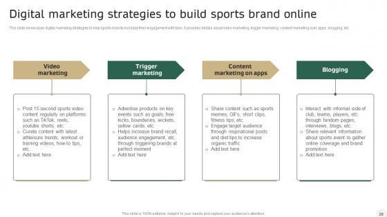 This slide showcases digital marketing strategies to help sports brands increase their engagement with fans. It provides details about video marketing, trigger marketing, content marketing over apps, blogging, etc. Slidegeeks has constructed Integrating Sports Marketing Campaign Digital Marketing Strategies To Build Sports Brand Clipart PDF after conducting extensive research and examination. These presentation templates are constantly being generated and modified based on user preferences and critiques from editors. Here, you will find the most attractive templates for a range of purposes while taking into account ratings and remarks from users regarding the content. This is an excellent jumping-off point to explore our content and will give new users an insight into our top-notch PowerPoint Templates.