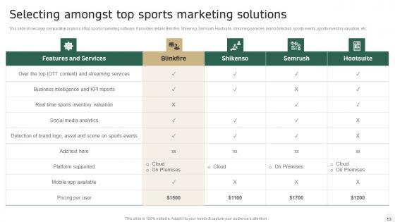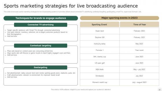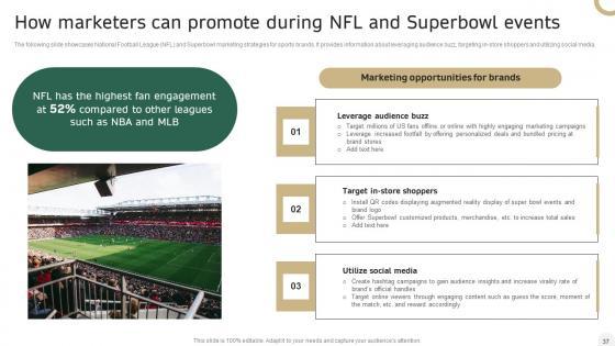 The following slide showcases National Football League NFL and Superbowl marketing strategies for sports brands. It provides information about leveraging audience buzz, targeting in-store shoppers and utilizing social media. Make sure to capture your audiences attention in your business displays with our gratis customizable How Sports Brands Can Digitally Promote Their In Depth Campaigning Guide Professional PDF These are great for business strategies, office conferences, capital raising or task suggestions. If you desire to acquire more customers for your tech business and ensure they stay satisfied, create your own sales presentation with these plain slides. The following slide showcases National Football League NFL and Superbowl marketing strategies for sports brands. It provides information about leveraging audience buzz, targeting in-store shoppers and utilizing social media.