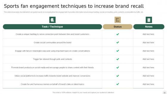 This slide showcases checklist which can guide brands on increasing their fan engagement. It provides information about unique hashtag, social communities, polls, contests, social platforms, traffic, etc. The best PPT templates are a great way to save time, energy, and resources. Slidegeeks have 100 percent editable powerpoint slides making them incredibly versatile. With these quality presentation templates, you can create a captivating and memorable presentation by combining visually appealing slides and effectively communicating your message. Download Fitness Product Promotion Campaigns Sports Fan Engagement Techniques To Increase Brand Recall Designs PDF from Slidegeeks and deliver a wonderful presentation.