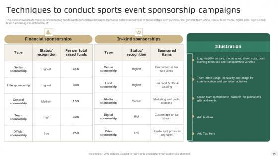 This slide showcases techniques for conducting sports event sponsorship campaigns. It provides details various types of sponsorships such as series, title, general, team, official, venue, food, media, digital, prize, logo visibility, team name usage, merchandise, etc. Slidegeeks is here to make your presentations a breeze with Integrating Sports Marketing Campaign Marketing Brand And Products At Soccer Events Rules PDF With our easy-to-use and customizable templates, you can focus on delivering your ideas rather than worrying about formatting. With a variety of designs to choose from, youre sure to find one that suits your needs. And with animations and unique photos, illustrations, and fonts, you can make your presentation pop. So whether youre giving a sales pitch or presenting to the board, make sure to check out Slidegeeks first.