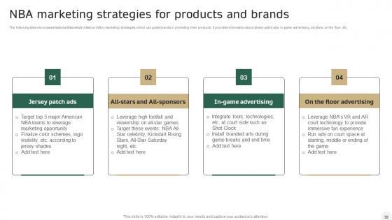 The following slide showcases National Basketball Alliance NBA marketing strategies which can guide brands in promoting their products. It provides information about jersey patch ads, in-game advertising, all-stars, on the floor, etc. Find highly impressive Integrating Sports Marketing Campaign Nba Marketing Strategies For Products And Brands Guidelines PDF on Slidegeeks to deliver a meaningful presentation. You can save an ample amount of time using these presentation templates. No need to worry to prepare everything from scratch because Slidegeeks experts have already done a huge research and work for you. You need to download Integrating Sports Marketing Campaign Nba Marketing Strategies For Products And Brands Guidelines PDF for your upcoming presentation. All the presentation templates are 100 percent editable and you can change the color and personalize the content accordingly. Download now.