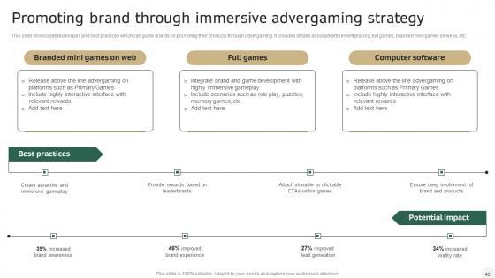 This slide showcases techniques and best practices which can guide brands on promoting their products through advergaming. It provides details about advertisement placing, full games, branded mini-games on webs, etc. Crafting an eye-catching presentation has never been more straightforward. Let your presentation shine with this tasteful yet straightforward Integrating Sports Marketing Campaign Promoting Brand Through Immersive Advergaming Sample PDF template. It offers a minimalistic and classy look that is great for making a statement. The colors have been employed intelligently to add a bit of playfulness while still remaining professional. Construct the ideal Integrating Sports Marketing Campaign Promoting Brand Through Immersive Advergaming Sample PDF that effortlessly grabs the attention of your audience Begin now and be certain to wow your customers.