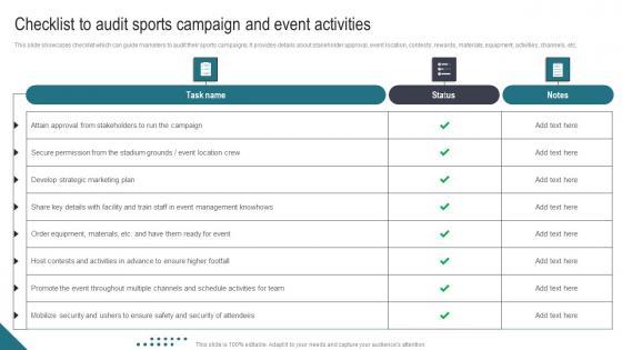 This slide showcases checklist which can guide marketers to audit their sports campaigns. It provides details about stakeholder approval, event location, contests, rewards, materials, equipment, activities, channels, etc. Get a simple yet stunning designed Checklist To Audit Sports Campaign And Event Athletic Activities Advertising Program Introduction Pdf. It is the best one to establish the tone in your meetings. It is an excellent way to make your presentations highly effective. So, download this PPT today from Slidegeeks and see the positive impacts. Our easy-to-edit Checklist To Audit Sports Campaign And Event Athletic Activities Advertising Program Introduction Pdf can be your go-to option for all upcoming conferences and meetings. So, what are you waiting for Grab this template today. This slide showcases checklist which can guide marketers to audit their sports campaigns. It provides details about stakeholder approval, event location, contests, rewards, materials, equipment, activities, channels, etc.