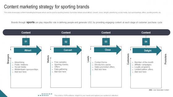 This slide showcases content marketing techniques which can be used by sporting brands. It provides details about attract, convert, close, delight, advertising, social media, club sponsorships, offers, sporting events, etc. Present like a pro with Content Marketing Strategy For Sporting Athletic Activities Advertising Program Infographics Pdf Create beautiful presentations together with your team, using our easy-to-use presentation slides. Share your ideas in real-time and make changes on the fly by downloading our templates. So whether you are in the office, on the go, or in a remote location, you can stay in sync with your team and present your ideas with confidence. With Slidegeeks presentation got a whole lot easier. Grab these presentations today. This slide showcases content marketing techniques which can be used by sporting brands. It provides details about attract, convert, close, delight, advertising, social media, club sponsorships, offers, sporting events, etc.