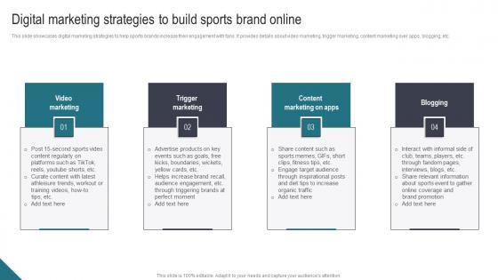 This slide showcases digital marketing strategies to help sports brands increase their engagement with fans. It provides details about video marketing, trigger marketing, content marketing over apps, blogging, etc. Slidegeeks is here to make your presentations a breeze with Digital Marketing Strategies To Build Sports Athletic Activities Advertising Program Diagrams Pdf With our easy-to-use and customizable templates, you can focus on delivering your ideas rather than worrying about formatting. With a variety of designs to choose from, you are sure to find one that suits your needs. And with animations and unique photos, illustrations, and fonts, you can make your presentation pop. So whether you are giving a sales pitch or presenting to the board, make sure to check out Slidegeeks first. This slide showcases digital marketing strategies to help sports brands increase their engagement with fans. It provides details about video marketing, trigger marketing, content marketing over apps, blogging, etc.
