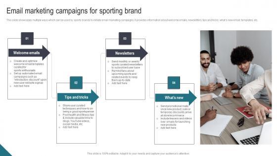 This slide showcases multiple ways which can be used by sports brands to initiate email marketing campaigns. It provides information about welcome emails, newsletters, tips and tricks, whats new email, templates, etc. Do you have an important presentation coming up Are you looking for something that will make your presentation stand out from the rest Look no further than Email Marketing Campaigns For Sporting Brand Athletic Activities Advertising Program Designs Pdf. With our professional designs, you can trust that your presentation will pop and make delivering it a smooth process. And with Slidegeeks, you can trust that your presentation will be unique and memorable. So why wait Grab Email Marketing Campaigns For Sporting Brand Athletic Activities Advertising Program Designs Pdf today and make your presentation stand out from the rest. This slide showcases multiple ways which can be used by sports brands to initiate email marketing campaigns. It provides information about welcome emails, newsletters, tips and tricks, whats new email, templates, etc.