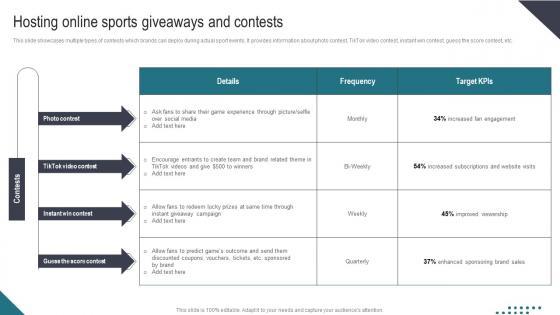 This slide showcases multiple types of contests which brands can deploy during actual sport events. It provides information about photo contest, TikTok video contest, instant win contest, guess the score contest, etc. If your project calls for a presentation, then Slidegeeks is your go-to partner because we have professionally designed, easy-to-edit templates that are perfect for any presentation. After downloading, you can easily edit Hosting Online Sports Giveaways And Contests Athletic Activities Advertising Program Themes Pdf and make the changes accordingly. You can rearrange slides or fill them with different images. Check out all the handy templates This slide showcases multiple types of contests which brands can deploy during actual sport events. It provides information about photo contest, TikTok video contest, instant win contest, guess the score contest, etc.