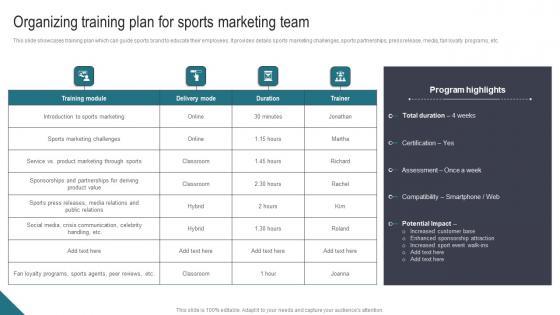 This slide showcases training plan which can guide sports brand to educate their employees. It provides details sports marketing challenges, sports partnerships, press release, media, fan loyalty programs, etc. Slidegeeks has constructed Organizing Training Plan For Sports Marketing Athletic Activities Advertising Program Inspiration Pdf after conducting extensive research and examination. These presentation templates are constantly being generated and modified based on user preferences and critiques from editors. Here, you will find the most attractive templates for a range of purposes while taking into account ratings and remarks from users regarding the content. This is an excellent jumping-off point to explore our content and will give new users an insight into our top-notch PowerPoint Templates. This slide showcases training plan which can guide sports brand to educate their employees. It provides details sports marketing challenges, sports partnerships, press release, media, fan loyalty programs, etc.