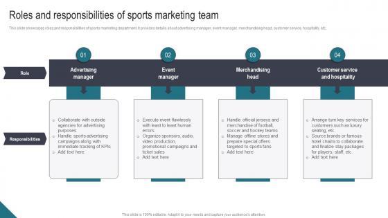 This slide showcases roles and responsibilities of sports marketing department. It provides details about advertising manager, event manager, merchandising head, customer service, hospitality, etc. Do you know about Slidesgeeks Roles And Responsibilities Of Sports Marketing Athletic Activities Advertising Program Guidelines Pdf These are perfect for delivering any kind od presentation. Using it, create PowerPoint presentations that communicate your ideas and engage audiences. Save time and effort by using our pre-designed presentation templates that are perfect for a wide range of topic. Our vast selection of designs covers a range of styles, from creative to business, and are all highly customizable and easy to edit. Download as a PowerPoint template or use them as Google Slides themes. This slide showcases roles and responsibilities of sports marketing department. It provides details about advertising manager, event manager, merchandising head, customer service, hospitality, etc.