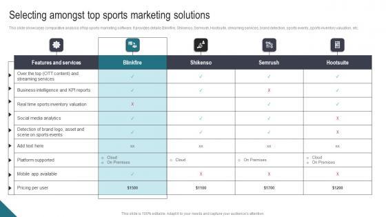 This slide showcases comparative analysis of top sports marketing software. It provides details Blinkfire, Shikenso, Semrush, Hootsuite, streaming services, brand detection, sports events, sports inventory valuation, etc. Find a pre-designed and impeccable Selecting Amongst Top Sports Marketing Athletic Activities Advertising Program Graphics Pdf. The templates can ace your presentation without additional effort. You can download these easy-to-edit presentation templates to make your presentation stand out from others. So, what are you waiting for Download the template from Slidegeeks today and give a unique touch to your presentation. This slide showcases comparative analysis of top sports marketing software. It provides details Blinkfire, Shikenso, Semrush, Hootsuite, streaming services, brand detection, sports events, sports inventory valuation, etc.