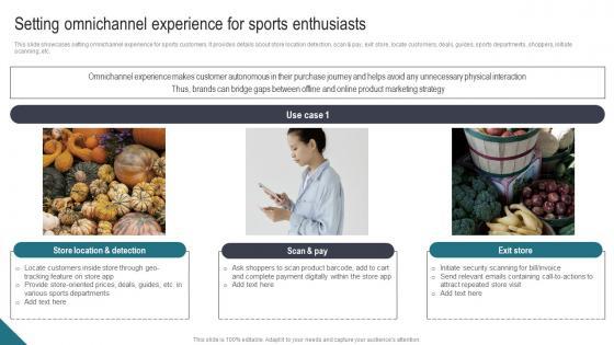 This slide showcases setting omnichannel experience for sports customers. It provides details about store location detection, scan and pay, exit store, locate customers, deals, guides, sports departments, shoppers, initiate scanning, etc. Boost your pitch with our creative Setting Omnichannel Experience For Sports Athletic Activities Advertising Program Ideas Pdf. Deliver an awe-inspiring pitch that will mesmerize everyone. Using these presentation templates you will surely catch everyones attention. You can browse the ppts collection on our website. We have researchers who are experts at creating the right content for the templates. So you do not have to invest time in any additional work. Just grab the template now and use them. This slide showcases setting omnichannel experience for sports customers. It provides details about store location detection, scan and pay, exit store, locate customers, deals, guides, sports departments, shoppers, initiate scanning, etc.