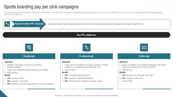 This slide shows key platforms which brands can use to initiate pay per click PPC campaigns. It provides details about Google Ads, Facebook Ads, Twitter Ads, clicks, conversions, audience reach, locational advertising, sponsored hashtags, etc. Create an editable Sports Branding Pay Per Click Campaigns Athletic Activities Advertising Program Template Pdf that communicates your idea and engages your audience. Whether you are presenting a business or an educational presentation, pre-designed presentation templates help save time. Sports Branding Pay Per Click Campaigns Athletic Activities Advertising Program Template Pdf is highly customizable and very easy to edit, covering many different styles from creative to business presentations. Slidegeeks has creative team members who have crafted amazing templates. So, go and get them without any delay. This slide shows key platforms which brands can use to initiate pay per click PPC campaigns. It provides details about Google Ads, Facebook Ads, Twitter Ads, clicks, conversions, audience reach, locational advertising, sponsored hashtags, etc.