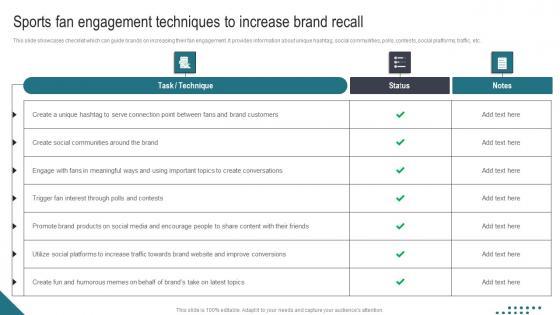 This slide showcases checklist which can guide brands on increasing their fan engagement. It provides information about unique hashtag, social communities, polls, contests, social platforms, traffic, etc. Slidegeeks is one of the best resources for PowerPoint templates. You can download easily and regulate Sports Fan Engagement Techniques Athletic Activities Advertising Program Professional Pdf for your personal presentations from our wonderful collection. A few clicks is all it takes to discover and get the most relevant and appropriate templates. Use our Templates to add a unique zing and appeal to your presentation and meetings. All the slides are easy to edit and you can use them even for advertisement purposes. This slide showcases checklist which can guide brands on increasing their fan engagement. It provides information about unique hashtag, social communities, polls, contests, social platforms, traffic, etc.
