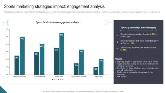 This slide showcases major impact of sports marketing strategies on overall stakeholder engagement. It provides details about repeated store visit, brand awareness, brand recall, employee engagement, sports sponsorship, etc. Do you have to make sure that everyone on your team knows about any specific topic I yes, then you should give PRODUCT NAME a try. Our experts have put a lot of knowledge and effort into creating this impeccable Sports Marketing Strategies Athletic Activities Athletic Activities Advertising Program Pictures Pdf. You can use this template for your upcoming presentations, as the slides are perfect to represent even the tiniest detail. You can download these templates from the Slidegeeks website and these are easy to edit. So grab these today. This slide showcases major impact of sports marketing strategies on overall stakeholder engagement. It provides details about repeated store visit, brand awareness, brand recall, employee engagement, sports sponsorship, etc.