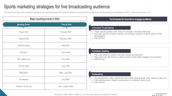 This slide showcases sports marketing strategies for live broadcasting audience. It provides details about connected TV advertising, contextual targeting, geotargeting, smart TVs, super bowl, formula 1, etc. Get a simple yet stunning designed Sports Marketing Strategies For Live Athletic Activities Advertising Program Download Pdf. It is the best one to establish the tone in your meetings. It is an excellent way to make your presentations highly effective. So, download this PPT today from Slidegeeks and see the positive impacts. Our easy-to-edit Sports Marketing Strategies For Live Athletic Activities Advertising Program Download Pdf can be your go-to option for all upcoming conferences and meetings. So, what are you waiting for Grab this template today. This slide showcases sports marketing strategies for live broadcasting audience. It provides details about connected TV advertising, contextual targeting, geotargeting, smart TVs, super bowl, formula 1, etc.